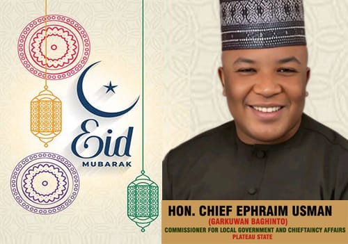 Plateau State Commissioner for Local Government and Chieftaincy Affairs, Hon Chief Ephraim Usman (The Garkuwan Baghinto) has joyfully felicitated with Muslims on the Plateau, Nigeria and around the globe on the auspicious occasion of Ramadan, signifying the end of Ramadan, a hallowed season which reflects total submission to God Almighty and His command of sacrifice, endurance, tolerance, unity, love and service to mankind.